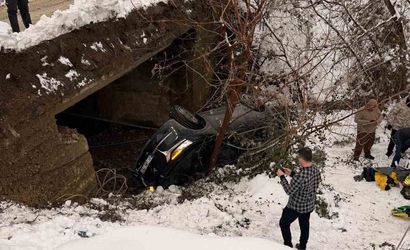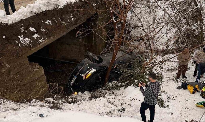 Hatay'ın Belen ilçesi Benlidere Mahallesi'nde meydana gelen kazada, kayganlaşan yol nedeniyle sürücüsünün kontrolünü kaybettiği otomobil dereye uçtu.