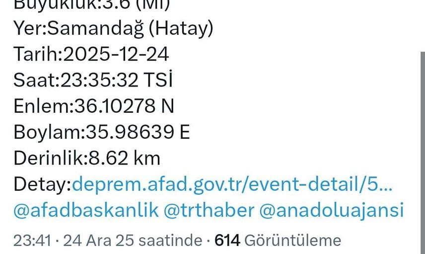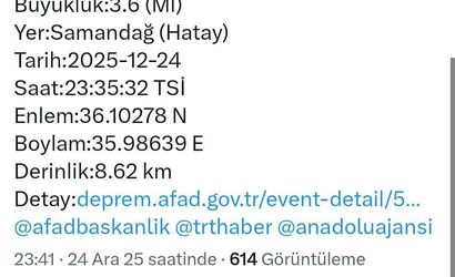 Merkez üssü Samandağ olan deprem 3,6 büyüklüğünde gerçekleşti ve 8,6 kilometre derinlikte meydana geldi. Depremin hissedilmesiyle birlikte tedirginlik yaşayan vatandaşlar sokaklara çıktı.