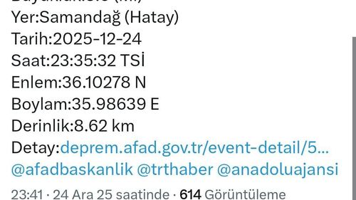 Hatay Samandağ'da 3,6 büyüklüğünde depremAFAD verilerine göre sarsıntı 8,6 km derinlikte kaydedildiHatay’ın Samandağ ilçesinde gece saatlerinde bir deprem meydana geldi. AFAD verilerine göre sarsıntı saat 23.35’te kaydedildi.Merkez üssü Samandağ olan deprem 3,6 büyüklüğünde gerçekleşti ve 8,6 kilometre derinlikte meydana geldi.…