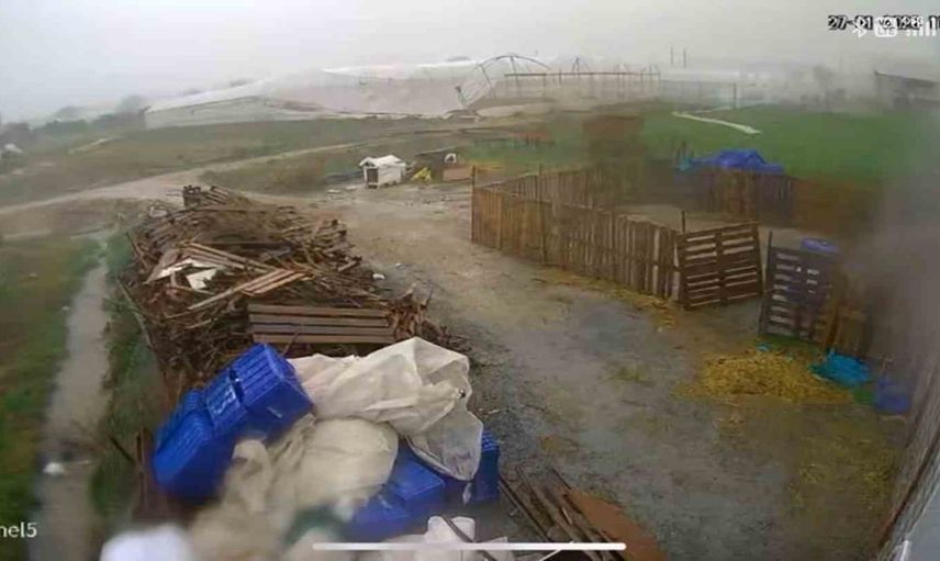 Zırlankaya Mahallesi’nde yaşanan hortumun seraya ulaştığı, naylonların koparak savrulduğu ve parçaların etrafa dağıldığı anlar görüntülere yansıdı. Kayıtlarda hortumun sağanak yağış anında serayı vurduğu ve naylonların koparak çevreye savrulduğu açıkça görülüyor.