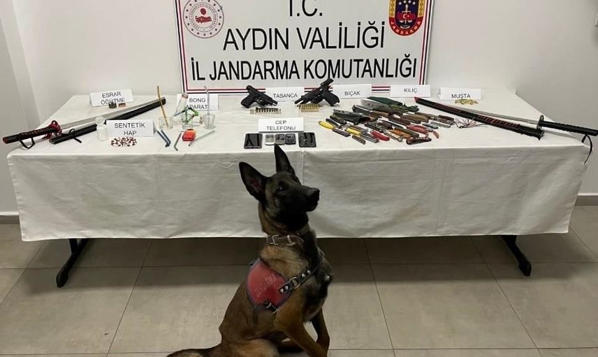 B. A. (42) ve N.Y. (32) isimli şahısların adreslerinde Jandarma Komando Timi, narkotik ve bomba arama köpeklerinin katılımıyla yapılan aramada, 51 adet sentetik hap, 2 adet bong aparatı, 2 adet tabanca, 59 fişek, 3 şarjör, 25 adet sustalı bıçak, 2 adet samuray kılıcı, 1 muşta, 5 cep telefonu ele geçirildi.