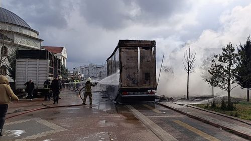 İnegöl Mesudiye Mahallesi'nde park halindeki sünger yüklü tır dorsesi alev alıp yanındaki mobilya yüklü dorsenin de tutuşmasına neden oldu; inceleme başlatıldı.