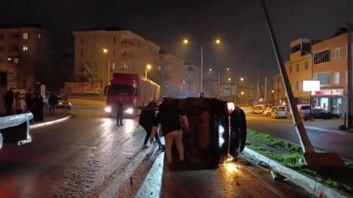 İnegöl'de yağış nedeniyle takla atan otomobil direğe çarptı: 3 yaralı