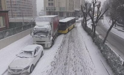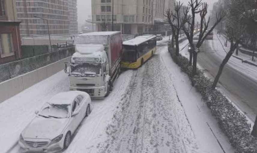 İstanbul'da etkili olan kar yağışı hayatı olumsuz etkilemeye devam ediyor. Bahçelievler 29 Ekim Caddesi'nde seyrederken karlı yolda kayan bir İETT otobüsü, park halindeki bir kamyona çarptı.