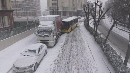 İstanbul Bahçelievler 29 Ekim Caddesi'nde İETT otobüsü karlı yolda kayarak park halindeki kamyona çarptı; otobüs boş, hasar ve trafik aksamaları yaşandı.