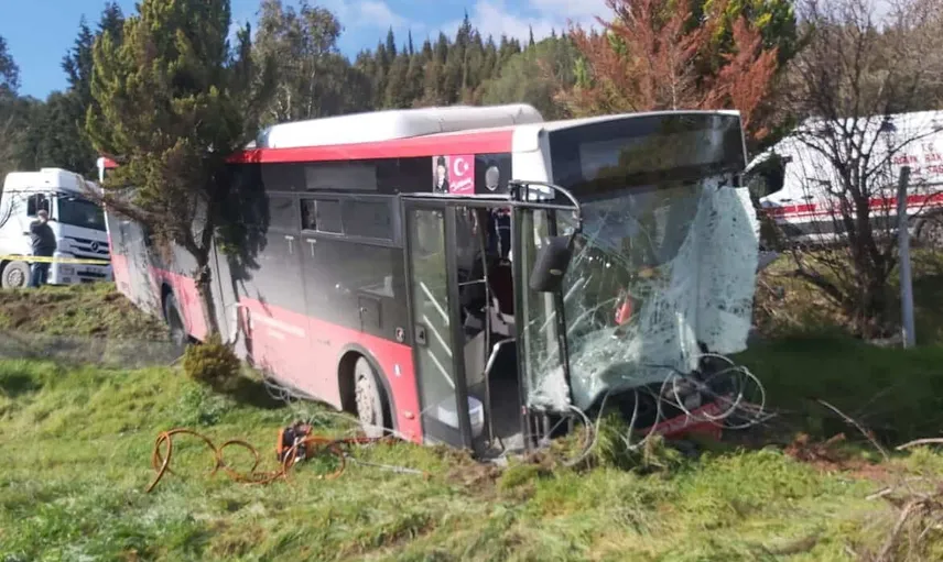 Çarpışmanın şiddetiyle belediye otobüsü yol kenarındaki araziye savrulurken, panelvandan kopan parçalar yola dağıldı.