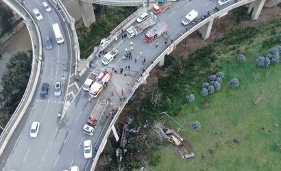 İzmir’in Buca ilçesi, 'Uçan Yol' olarak bilinen Homeros Bulvarı üzerindeki viyadükte kaza meydana geldi. İddiaya göre, seyir halindeki bir çekicinin freni boşaldı. Kontrolden çıkan çekici, önünde seyreden otomobile çarptı. Çarpmanın etkisiyle savrulan otomobil bariyerleri aşarak viyadükte asılı kalırken, hızını alamayan çekici metrelerce yükseklikten aşağı düştü.