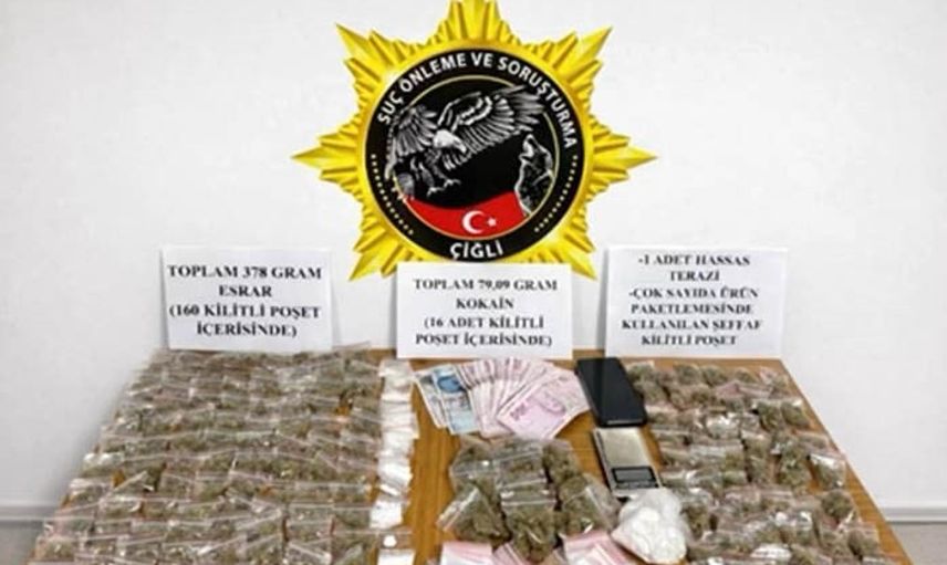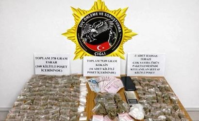 Yapılan aramalarda; 160 ayrı kilitli poşet içerisinde toplam 378 gram esrar, 16 ayrı kilitli poşet içerisinde 79.9 gram kokain, uyuşturucu tartımında kullanılan 1 adet hassas terazi ile hazırlık için stoklanmış çok sayıda boş kilitli poşet ele geçirildi.