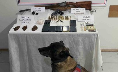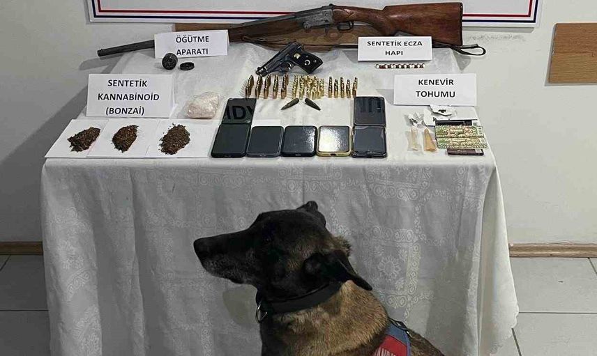 Aramalarda ele geçirilenler arasında 57 gram sentetik kannabinoid katkılı tütün, 18 adet sentetik ecza hapı, 3 gram kenevir tohumu, 1 adet uyuşturucu madde öğütme aparatı, 19 adet kilitli poşet, 1 adet ruhsatsız tabanca, 70 adet tabanca fişeği, 1 adet ruhsatsız av tüfeği, 7 adet cep telefonu ve 7 adet SIM kart yer aldı.
