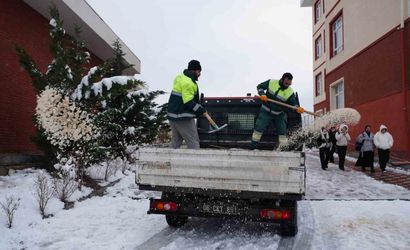 Kar yağışı sırasında araç ulaşımı için yürütülen kar küreme ve tuzlama çalışmaları, gündüz saatlerinde yaya trafiğini kolaylaştırmak amacıyla devam ettirildi. Okul bahçeleri, ana yaya güzergahları ve mahalle içi kaldırımlar öncelikli olarak temizlenirken, bu çalışmalarla kayma ve düşme riskleri önlenmeye çalışılıyor.