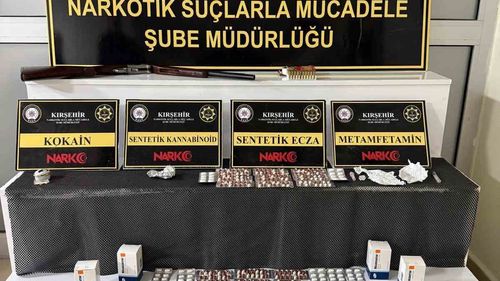 Kırşehir'de düzenlenen operasyonda çeşitli uyuşturucular, ruhsatsız av tüfeği ve fişekler ele geçirildi; 1 kişi tutuklandı, iki kişi hakkında işlem yapıldı.