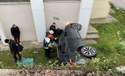 Araç, yaklaşık 4 metre yüksekliğindeki istinat duvarından binanın bahçesine düştü. Kazada otomobilde bulunan sürücü ile kızı yaralandı.