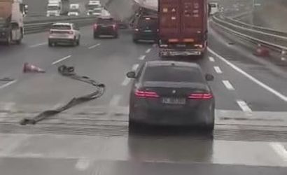 Kuzey Marmara Otoyolu'nda fırtına tırı devirdi — O anlar kamerada