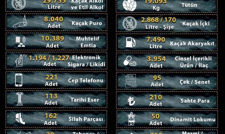 24 milyon 801 bin 242 adet kaçak makaron, 34 bin 540 paket kaçak sigara, 19 bin 93 kilogram tütün ve nargile tütünü, 8 bin 40 adet puro, bin 194 adet elektronik sigara ve bin 227 adet likit ele geçirildi.