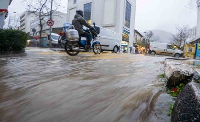 Caddelerdeki yağmur suyu birikmeleri, bazı noktaların adeta dere yatağına dönmesine yol açtı. Vatandaşlar caddeden kaldırıma geçmekte zorlanırken, dükkanların önünde oluşan su birikintileri nedeniyle esnaf kapı önlerindeki suları çekip mağazalarına girmeyi sağladı.