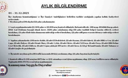 Rapora göre ilçede bir aylık süreçte 8 trafik kazası meydana geldi; bu kazalarda 6 kişi yaralandı ve 2 vatandaş hayatını kaybetti. Trafik denetimlerinde 5.241 araç kontrol edilirken, 167 araca ve 24 yayaya cezai işlem uygulandı. Toplamda 606.378 TL idari para cezası kesildi ve 23 araç trafikten men edildi.