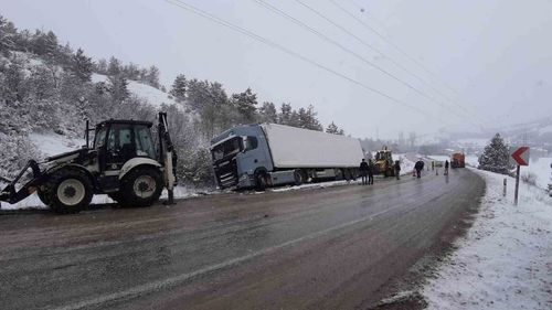 Mudurnu-Nallıhan karayolunda yoğun kar nedeniyle rampada kayan 14 LC 560 plakalı tır şarampole devrildi; iki kepçeyle güçlükle çıkarıldı, yaralanma yok.