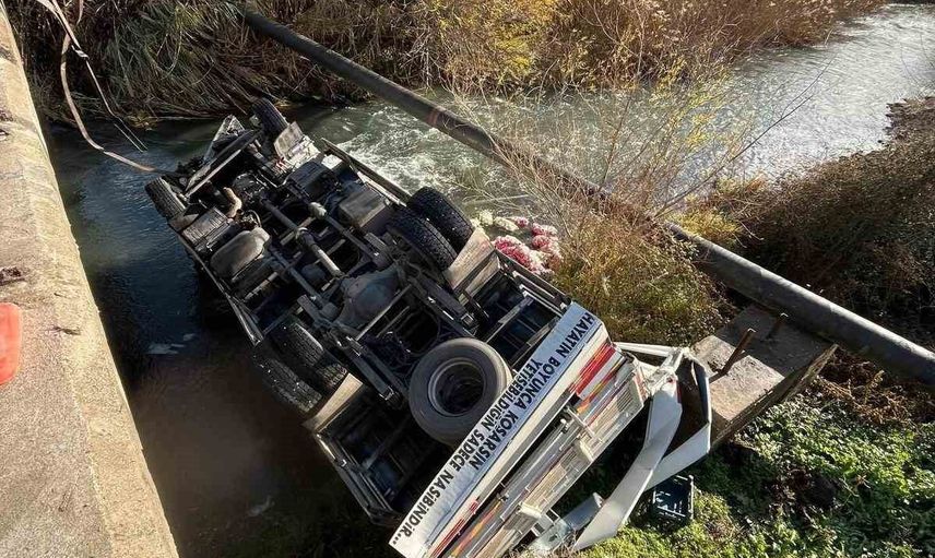 Osmaniye’de kontrolden çıkan turp yüklü kamyon, köprü korkuluklarını kırarak dere yatağına düştü. Kazada kamyon şoförü yaralandı.