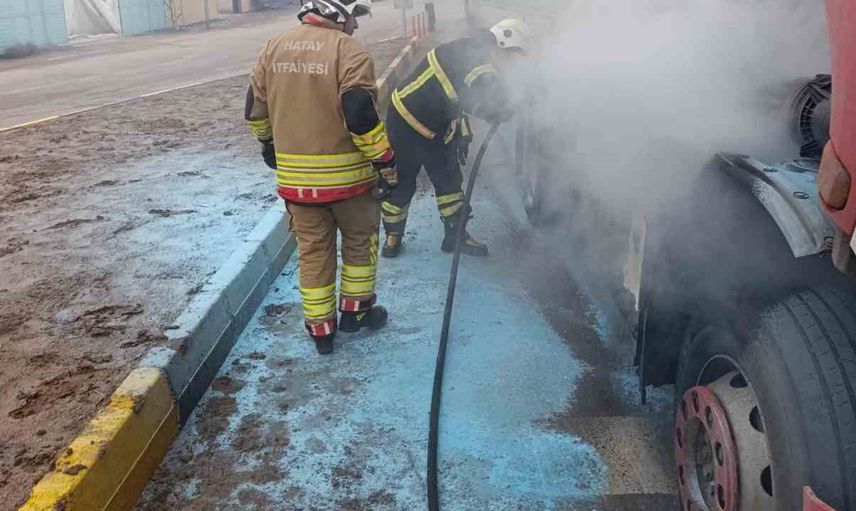 Hatay'ın Reyhanlı ilçesinde, E-5 kara yolu üzerinde seyir halindeki bir tırın motor bölümünde yangın çıktı.