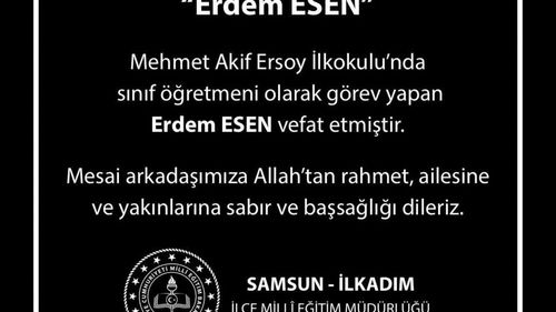 Samsun'un İlkadım ilçesindeki Mehmet Akif Ersoy İlkokulu öğretmeni Erdem Esen, kalp krizi sonucu vefat etti; cenazesi 4 Ocak Pazar defnedilecek.