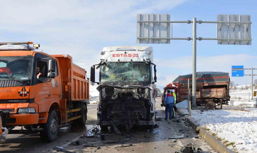 Çarpışmanın etkisiyle savrulan kamyonet, refüjde bulunan yön tabelası direğine çarparak durdu. Tır sürücüsü yara almadan atlatırken, kamyonet sürücüsü Yadigar Demiral ile araçta yolcu olarak bulunan Sema Demirel (47) yaralandı.