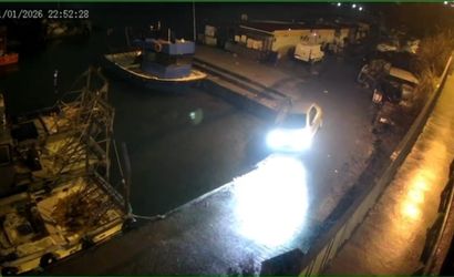 O anlar balıkçı barınağının güvenlik kamerasında görüntülendi. Görüntülerde aracın yoldan çıktığı ve mendirekte asılı kaldığı anlar net şekilde görülüyor.