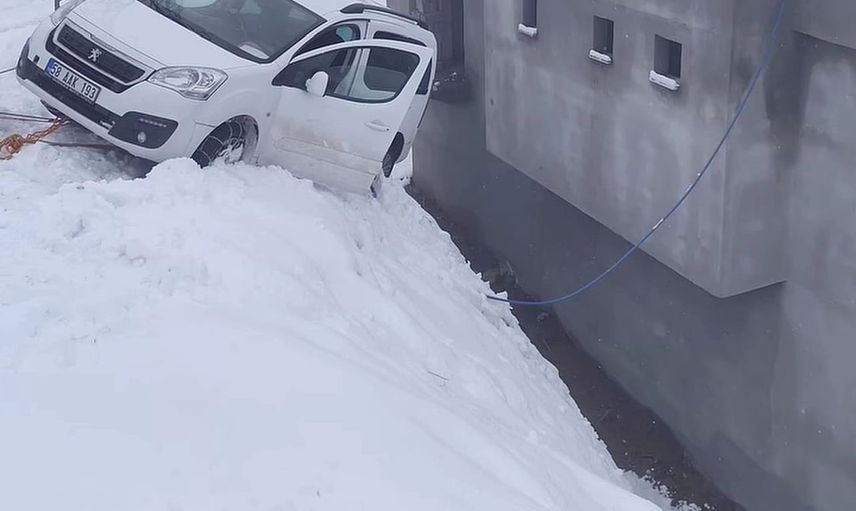 Siirt'in Baykan ilçesi Sarısalkım köyünde, buzlanma nedeniyle kontrolden çıkan hafif ticari araç bir evin çevre duvarında asılı kaldı.
