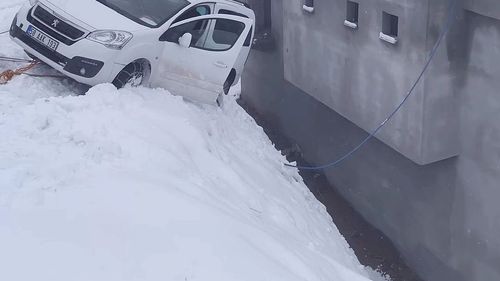Siirt'in Baykan ilçesi Sarısalkım köyünde buzlanma nedeniyle kayan hafif ticari araç bir evin duvarında asılı kaldı; can kaybı yok.
