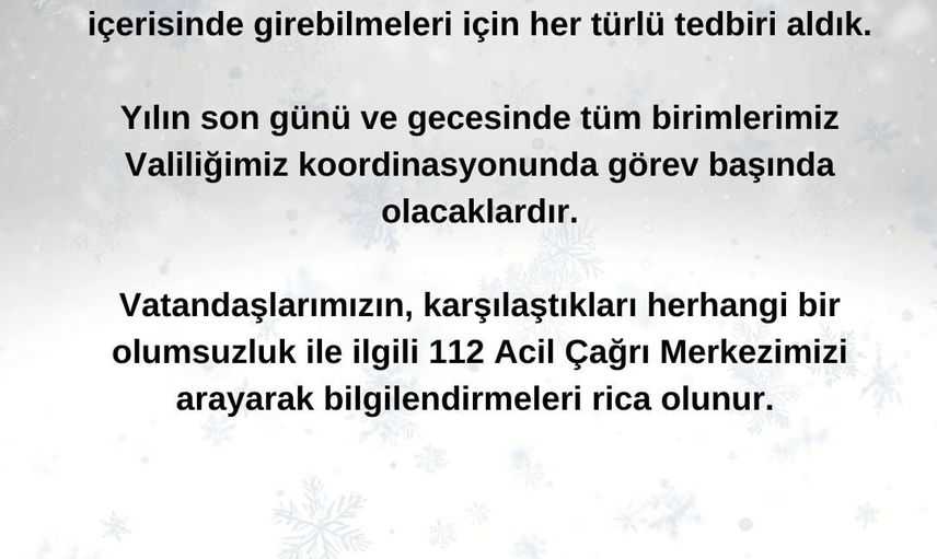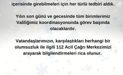 "Vatandaşlarımızın yeni yıla huzur ve güven içerisinde girebilmeleri için her türlü tedbir alınmıştır. Yılın son günü ve gecesinde tüm birimlerimiz valiliğimiz koordinasyonunda görev başında olacaktır. Karşılaşılan herhangi bir olumsuzluk durumunda 112 Acil Çağrı Merkezimizin aranması rica olunur"