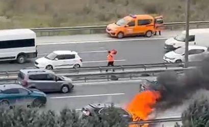 TEM HADIMKÖY BAĞLANTI YOLU ESENYURT MEVKİİNDE, BMW MARKA BİR ARACIN MOTOR KISMINDA BAŞLAYAN YANGIN, DAKİKALAR İÇİNDE ARACI KÜLE ÇEVİRDİ. ALEV TOPUNA DÖNEN ARAÇ İSE İTFAİYE EKİPLERİNCE SÖNDÜRÜLÜRKEN, YAŞANAN O ANLAR KAMERAYA YANSIDI.
