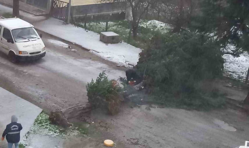 Edinilen bilgiye göre, ilçe genelinde devam eden olumsuz hava şartları nedeniyle Tümerkan Mahallesi Gazi Mustafa Kemal Atatürk Caddesi üzerinde bulunan bir ağaç şiddetli rüzgarın etkisiyle devrildi.