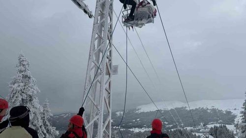 Uludağ Birinci Oteller Bölgesi'nde Fahri Otel telesiyejinde vites kutusu arızası nedeniyle yaklaşık 40 tatilci kabinlerde mahsur kaldı; JAK, AFAD ve itfaiye kurtarma çalışmalarını sürdürüyor.