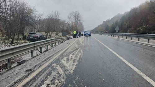 Zonguldak-İstanbul karayolunda kaygan zeminde kontrolden çıkan otomobil bariyere çarpıp takla attı; 2 kişi yaralandı, hayati tehlikeleri yok.
