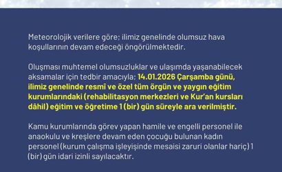 "Oluşması muhtemel olumsuzluklar ve ulaşımda yaşanabilecek aksamalar için tedbir amacıyla; 14 Ocak Çarşamba günü ilimiz genelinde resmi ve özel tüm örgün ve yaygın eğitim kurumlarındaki (Rehabilitasyon merkezleri ve Kur’an kursları dahil) eğitim ve öğretime 1 gün süreyle ara verilmiştir. Kamu kurumlarında çalışan hamile, engelli personel, kronik rahatsızlığı bulunan, anaokulu ve kreşlere devam eden çocuğu bulunan kadın personellerimiz, 1 gün süreyle idari izinli sayılacaktır"