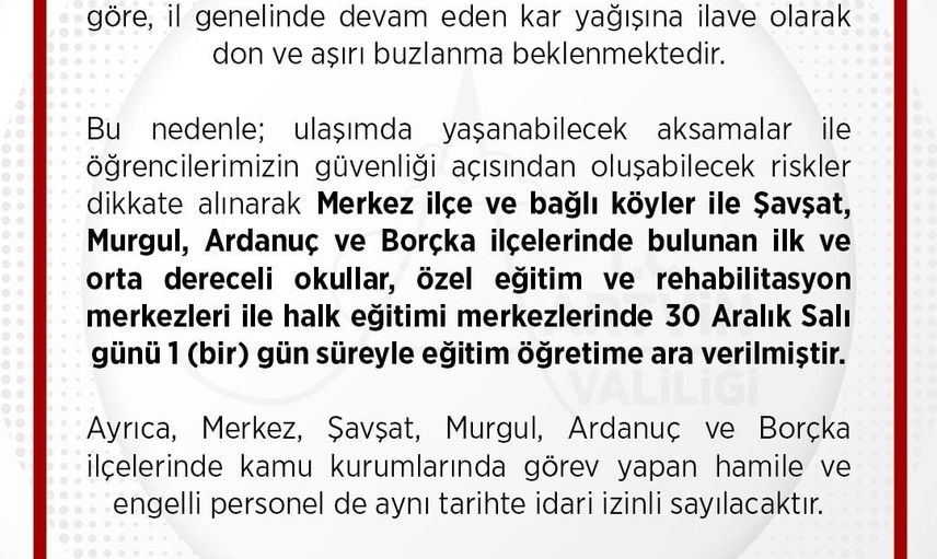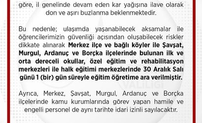 Ulaşımda yaşanabilecek aksamalar ile öğrencilerin güvenliği göz önünde bulundurularak; Artvin merkez ilçe ve bağlı köyler ile Şavşat, Murgul, Ardanuç ve Borçka ilçelerinde bulunan ilk ve orta dereceli okullar, özel eğitim ve rehabilitasyon merkezleri ile halk eğitim merkezleri için 30 Aralık Salı günü eğitim öğretime bir gün süreyle ara verildi.