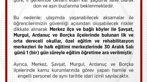 Artvin'de kar, don ve aşırı buzlanma riski nedeniyle Artvin merkez ile Şavşat, Murgul, Ardanuç ve Borçka'da 30 Aralık Salı günü eğitime 1 gün ara verildi.