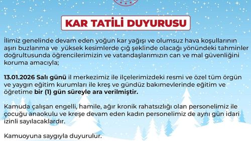 Bingöl Valiliği, yoğun kar ve buzlanma nedeniyle 13.01.2026 Salı günü il genelinde eğitime 1 gün ara verildiğini açıkladı.