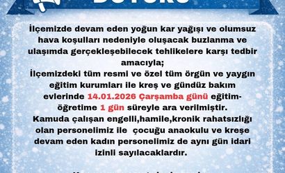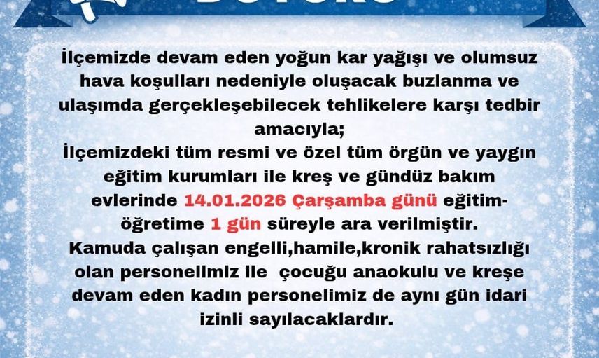 Açıklamalarda, 14 Ocak 2026 Çarşamba günü ilçeler genelindeki resmi ve özel tüm eğitim kurumlarında eğitim ve öğretime 1 gün süreyle ara verildiği duyuruldu.