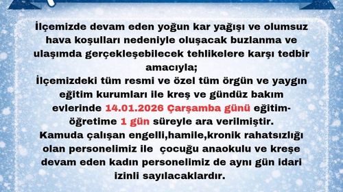 Bingöl'ün Kiğı, Karlıova ve Adaklı ilçelerinde yoğun kar yağışı, buzlanma ve ulaşım riskleri nedeniyle 14 Ocak 2026 Çarşamba günü eğitime 1 gün ara verildi.