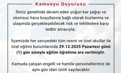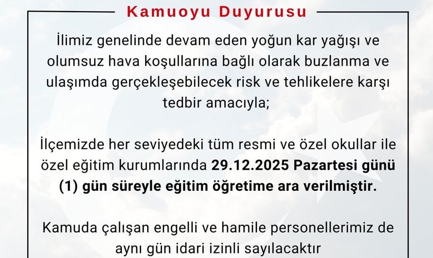 Açıklamaya göre, 29 Aralık 2025 Pazartesi günü ilçelerdeki her seviyedeki tüm resmi ve özel okullar ile özel eğitim kurumlarında eğitim ve öğretime 1 gün süreyle ara verileceği bildirildi.