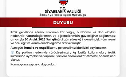 Diyarbakır Valiliği, kar yağışı ve buzlanma nedeniyle eğitime yarın da ara verildiğini duyurdu.
