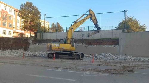 Edirne'de Gazi Osman Paşa Ortaokulu'nun devrilme riski taşıyan yaklaşık 100 metrelik istinat duvarı yıkılıp, öğrenciler için yeniden inşa ediliyor.