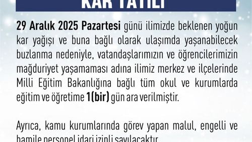 Elazığ Valiliği, 29 Aralık 2025 Pazartesi beklenen yoğun kar ve buzlanma nedeniyle il genelinde okullarda eğitim-öğretime 1 gün ara verildiğini ve bazı kamu personelinin izinli sayılacağını duyurdu.