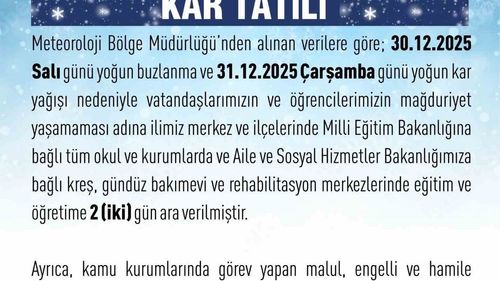 Elazığ'da Eğitime 2 Gün Ara Elazığ’da yoğun buzlanma ve kar yağışı nedeniyle il genelinde eğitim ve öğretime 2 (iki) gün ara verildi. Valilik Açıklaması Elazığ Valiliği’nden yapılan açıklamada, "Meteoroloji Bölge Müdürlüğü’nden alınan verilere göre; 30.12.2025 Salı günü yoğun buzlanma ve…