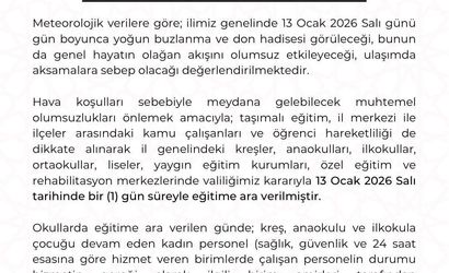 "Hava koşulları sebebiyle meydana gelebilecek olumsuzları önlemek amacıyla taşımalı eğitim, il merkezi ile ilçeler arasındaki kamu çalışanları ve öğrenci hareketliliği de dikkate alınarak il genelindeki kreşler, anaokulları, ilkokullar, ortaokullar, liseler, yaygın eğitim, özel eğitim ve rehabilitasyon merkezlerinde valiliğimiz kararıyla 13 Ocak Salı günü eğitime 1 gün süreyle ara verilmiştir."