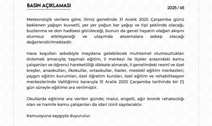 Bu karar kapsamında il genelinde resmi ve özel tüm kreşler, anaokulları, ilkokullar, ortaokullar, liseler, mesleki eğitim merkezleri, yaygın eğitim kurumları, özel öğretim kursları ile özel eğitim ve rehabilitasyon merkezlerinde 31 Aralık 2025 Çarşamba günü bir gün süreyle eğitim yapılmayacak.