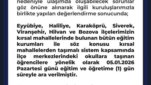 Şanlıurfa'da Eyyübiye, Haliliye, Karaköprü, Siverek, Viranşehir, Hilvan ve Bozova kırsalındaki okullarda 5 Ocak 2026 pazartesi günü buzlanma nedeniyle eğitime 1 gün ara verildi.