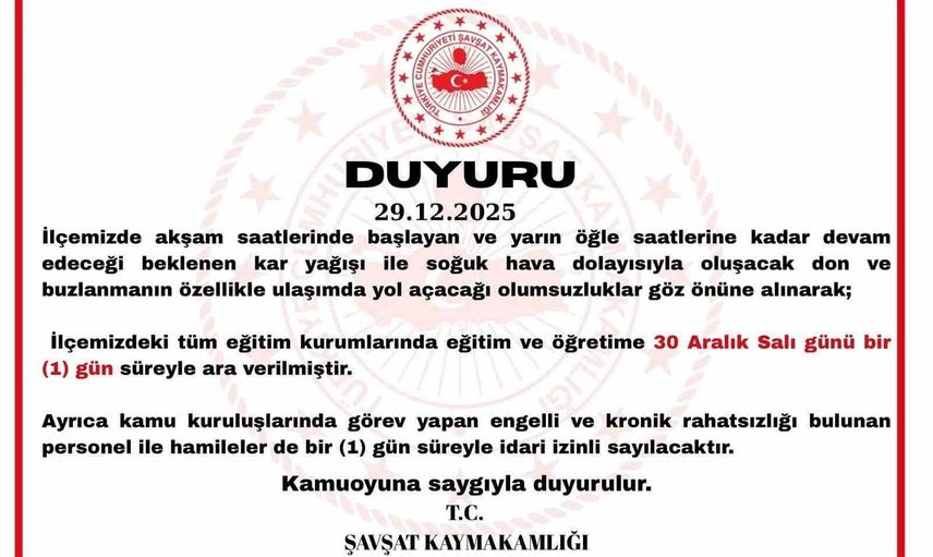 Şavşat Kaymakamlığı tarafından yapılan açıklamada, kar, don ve buzlanmanın özellikle ulaşımda aksamalara yol açabileceği belirtilerek, bu nedenle ilçedeki tüm eğitim kurumlarında 30 Aralık Salı günü eğitim ve öğretime bir gün süreyle ara verildiği duyuruldu.