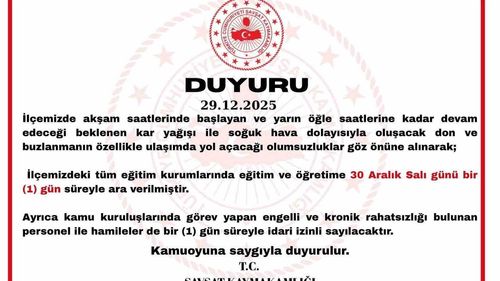 Şavşat Kaymakamlığı, 30 Aralık Salı günü beklenen kar, don ve buzlanma nedeniyle ilçedeki tüm eğitim kurumlarında eğitime bir gün ara verildiğini açıkladı.
