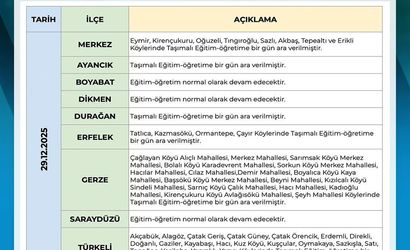 Valilik açıklamasına göre, olumsuz hava koşullarının ulaşımda risk oluşturabileceği değerlendirilerek 29 Aralık 2025 Pazartesi günü Ayancık ve Durağan ilçelerinde taşımalı eğitim tamamen durduruldu. Merkez ilçe ile birlikte Erfelek, Gerze ve Türkeli ilçelerinin bazı bölgelerinde taşımalı eğitime kısmi ara verildi. Öte yandan Boyabat, Dikmen ve Saraydüzü ilçelerinde eğitim öğretimin normal şekilde devam edeceği bildirildi.